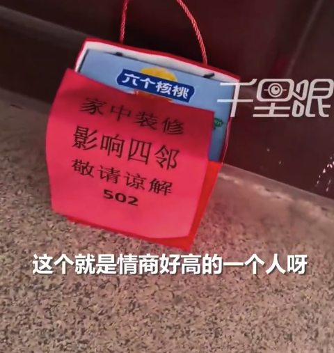 业主装修给全楼送饮料求谅解 邻居:避免了噪音引发不快 4月7日,河北邢台。一业主家装修,给全楼共5层9户邻居挨家送饮料,并贴有请谅解的字条。邻居梁女士称,感觉这家业主情商很高很暖心,避免了因装修噪音引发的不愉快。... 04-09