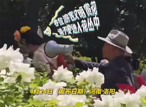 游客踩踏牡丹遭喇叭怼脸提醒 景区回应 4月23日,河南洛阳,有游客不听劝阻进入牡丹花圃拍照,工作人员拿喇叭怼脸式提醒,引发热议。景区回应称,已贴告示但仍有游客踩踏牡丹,为了保护本就不多的牡丹,才采取这种方式,呼吁大家文明赏花,将心比心。... 04-24