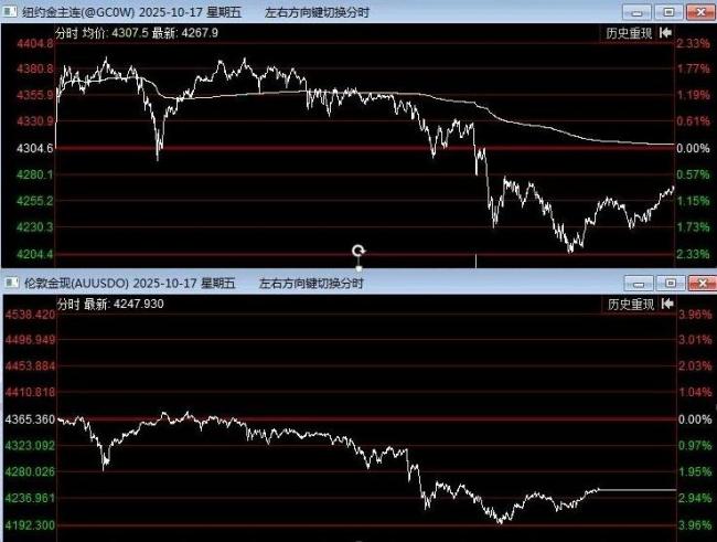 深夜跳水,一个“危险信号”出现 贵金属市场波动加剧 上周五夜盘,贵金属市场经历了显著波动。17日COMEX黄金白盘一度刷新历史新高至4392美元/盎司,但夜盘迅速跳水跌超2%,最低下探至4229.7美元/盎司,振幅高达4.55%;与此同时,伦敦金当日收跌2.69%,一度失守4200美元 10-23