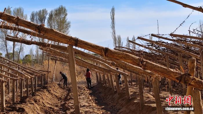春来“掀被子” 甘肃敦煌万亩葡萄藤破土“上岗” 中新网兰州4月9日电 (王斌银 周玉玲)4月以来,在甘肃敦煌市阳关镇等葡萄主产区,广袤的田间地头一派繁忙景象,农户们抢抓农时,为埋土越冬的葡萄藤“掀被”出土、整理上架,6.8万亩葡萄藤在春日暖阳中舒展枝蔓,勾勒 04-09