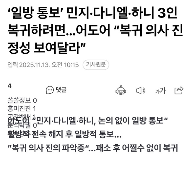 ADOR内部难以立即接受NewJeans另外三人回归声明
