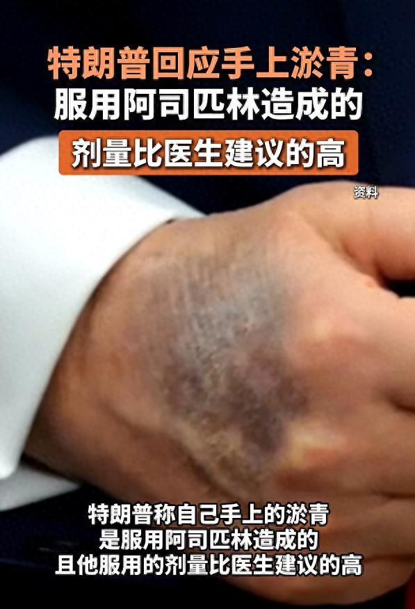 特朗普手上出现淤青 本人公布原因 阿司匹林所致 在《华尔街日报》1月1日发布的专访中,特朗普回应了多次被拍到手上出现大片淤青一事。他称手上的淤青是服用阿司匹林造成的,且他服用的剂量比医生建议的高。特朗普解释说,阿司匹林有助于稀释血液,他希望清澈的血液畅通地流过心脏,因此选择服用更大剂量 01-04