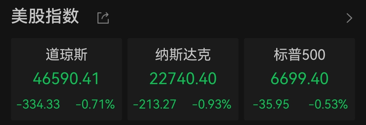 美股三大指数集体收跌 奈飞跌超10% 中新经纬10月23日电 美东时间周三,美股三大指数集体下跌。截至收盘,道指跌334.33点,跌幅0.71%,报46590.41点;纳指跌213.27点,跌幅0.93%,报22740.40点;标普500指数跌35.95点,跌幅0.53%,报6699.40点。 10-23