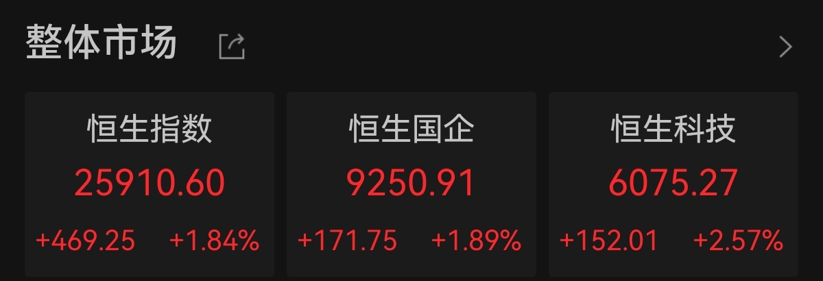 恒生科指收涨2.57% 芯片股集体上扬 中新经纬10月15日电 周三,港股三大指数集体上涨。截至收盘,恒生指数涨1.84%,恒生科技指数涨2.57%,恒生国企指数涨1.89%。大市成交额3158亿港元。 10-15