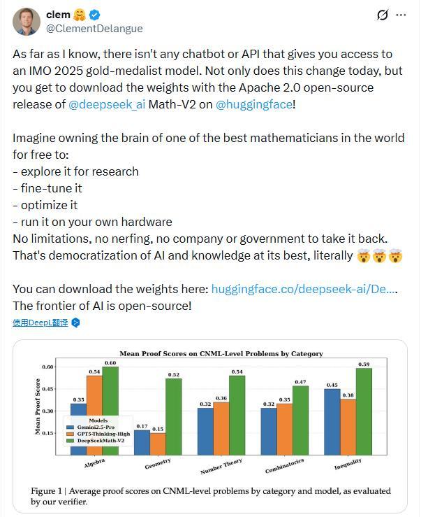 DeepSeek新模型有多猛 开源AI的重大突破 DeepSeek最新发布的开源数学模型DeepSeekMath-V2,在全球最难的高中数学竞赛中达到了金牌水平,成为首个实现这一成就的开源模型,标志着开源人工智能在复杂推理能力上的一次重大突破 11-28
