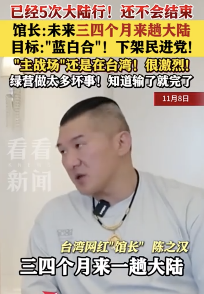 馆长表示未来三四个月来一趟大陆! 馆长表示未来三四个月来一趟大陆。台湾网红“馆长”陈之汉从第五次大陆行归来后,11月8日接受媒体专访。他表示自己“未来三四个月来一趟大陆,‘主战场’还是在台湾。”并称自己的主要目标是“蓝白合”和下架民进党。“馆长”表示竞争会很激烈,因为民进党... 11-10