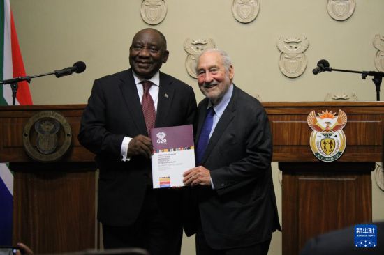 二十国集团报告呼吁国际社会共同应对全球不平等问题 11月4日,在南非立法首都开普敦,二十国集团应对全球不平等问题特别独立专家委员会主席、诺贝尔经济学奖得主约瑟夫·施蒂格利茨(右)向南非总统拉马福萨提交关于全球不平等问题的报告。新华社发(沙姬拉·泰比摄 11-05