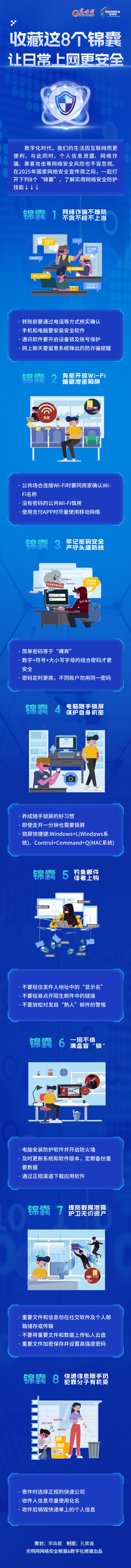 一图读懂|@所有人,收藏这8个锦囊,让日常上网更安全 数字化时代,我们的生活因互联网而更便利,与此同时,个人信息泄露、网络诈骗、黑客攻击等风险也不容忽视。在2025年国家网络安全宣传周之际,一起打开8个“锦囊”,了解实用网络安全防护技能↓↓↓ 09-15