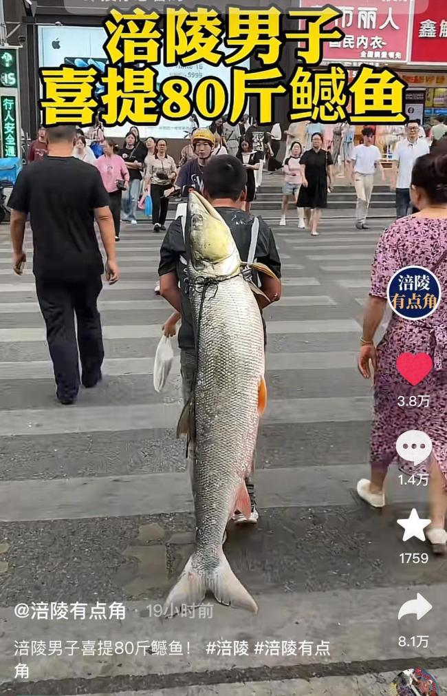 男子背着钓到的79斤鳡鱼在闹市穿行 高光时刻引围观 9月10日,重庆市涪陵区一名男子背着一条重达79斤的大鱼在闹市行走的视频引起了广泛关注。视频中,这名男子背着一米多长的鱼,在市区中穿行,路人纷纷露出惊讶的表情。网友们看到后纷纷表示,也想体验一下背这条大鱼的感觉 09-11