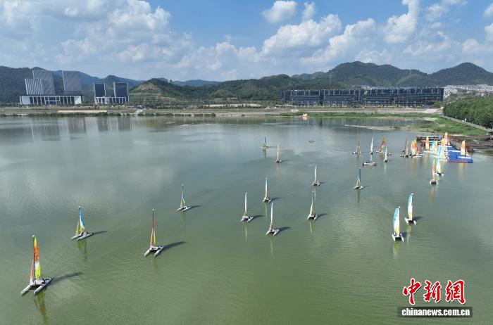 浙江杭州:2025中国家庭帆船赛扬帆绿水青山间 9月27日,众多帆船启航。当日,2025中国家庭帆船赛·杭州站在浙江杭州临安青山湖拉开帷幕,来自北京、上海、武汉等10个城市的40组家庭近百名选手在绿水青山间扬帆。(无人机照片)中新社记者 王刚 摄 09-28