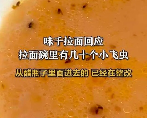 女子味千拉面吃出数十飞虫,店方称醋瓶未冷藏致虫害 近日,广东深圳,一女子发视频称自己在味千拉面店里吃拉面,发现碗里有几十个小飞虫。对此,店铺工作人员回应记者称,可能是醋瓶子里的小飞虫,醋的气味比较重,没有及时放冰箱,引来了小飞虫,目前已在整改,会加强管理,还在和顾客协商赔偿的事。... 10-14