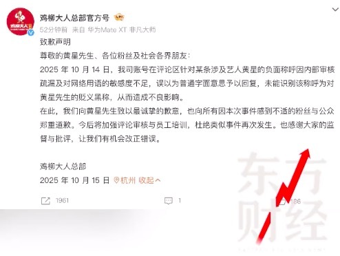 鸡柳大人官方致歉回复黄星黑称 10月15日,@鸡柳大人总部官方号发布致歉声明,“尊敬的黄星先生、各位粉丝及社会各界朋友:2025年10月14日,我司账号在评论区针对某条涉及艺人黄星的负面称呼因内部审核疏漏及对网络用语的敏感度不足,误以为普通字面意思予以回复,未能识别该称... 10-15