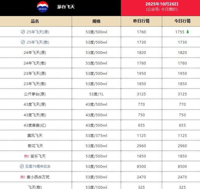 茅台价格继续下跌 市场行情波动 格隆汇10月26日|今日酒价披露的批发参考价显示,10月26日,25年飞天茅台原箱较前一日下跌5元,报1755元/瓶;25年飞天茅台散瓶较前一日持平,报1730元/瓶 10-27