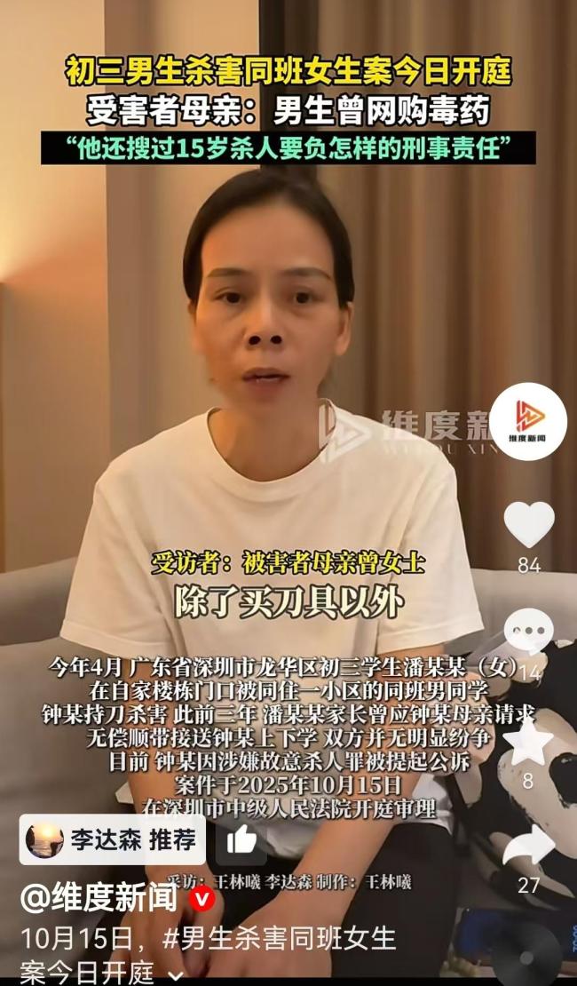 深圳初中生杀害同学案后续 凶手预谋作案引发关注 10月15日,深圳一名初三男生因涉嫌杀害同学潘某某的案件开庭审理。庭审前,潘某某的母亲接受了采访,讲述了女儿被杀的大致经过。命案发生在4月份,这名男孩预谋作案,不仅在网上购买了行凶用的刀具,还尝试购买毒药,但由于毒药是管制用品未能成功发货 10-17