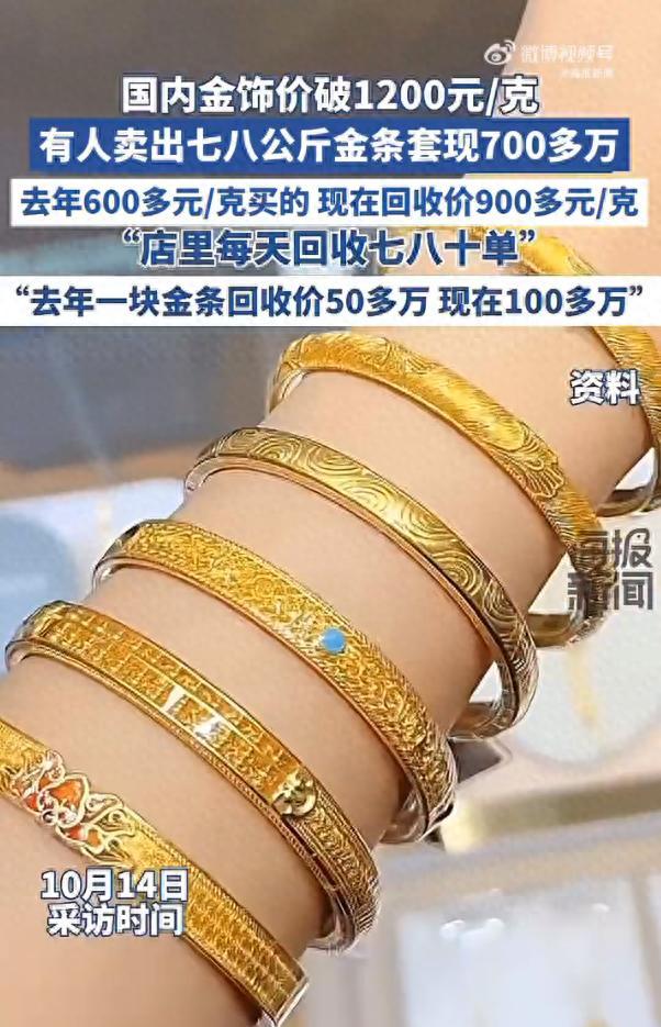 金价飙升有人卖金条变现700多万 珠宝品牌金价跟涨 国际金价波动影响了中国国内珠宝品牌的足金首饰价格,10月14日,老庙黄金的足金饰品价格上涨至每克1218元。同一天,厦门一位黄金回收商表示,近期每天能成交几十单,有人甚至将去年购买的金条卖出,套现超过700万元 10-17