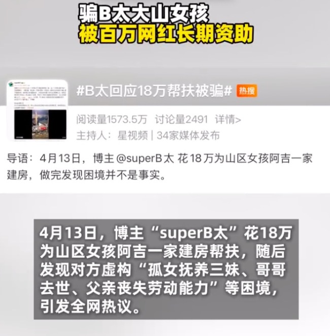阿吉曾主动要求百万网红帮忙建新房 骗B太大山女孩被百万网红长期资助 4月13日,博主@superB太花18万为山区女孩阿吉一家建房帮扶,随后发现对方虚构“孤女抚养三妹、哥哥去世、父亲丧失劳动能力”等困境,引发全网热议。据悉,另一百万博主“澳门老炮”也曾帮扶过阿吉一家,为其建造房子提供资助,并认其中一女孩为干... 04-16