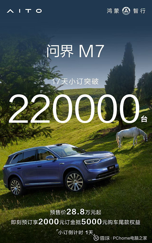 新问界M7小订超22万台 市场热度高涨 9月22日,微博博主我鸿分享称,全新问界M7在上市前已获得超过22万台小订订单,仅用时17天,显示出较强的市场热度。新车预售价为28.8万元起。问界M7提供六种车身颜色选择,包括海岛蓝、暖云白、牧野青、珊瑚红、星际蓝和鎏金黑 09-23