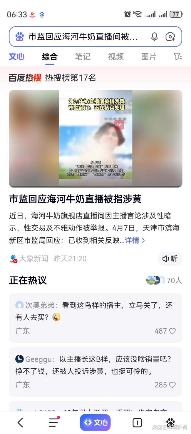 网友质疑海河牛奶甩锅营销公司 低俗直播引众怒 天津海河牛奶抖音直播间因涉黄内容引发广泛关注。2026年4月7日,该直播间被曝长期存在低俗言论和不雅动作,主播频繁使用性暗示词汇如“崩锅”等,导致一名六年级女童学会并询问家长这些词汇的含义。此事迅速在网络上引起公愤 04-08