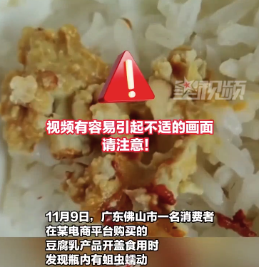 网购豆腐乳里现多条蛆虫蠕动 平台:确有问题,或因密封不严漏气所致 11月9日,广东佛山市一名消费者在某电商平台购买的豆腐乳产品开盖食用时,发现瓶内有蛆虫蠕动。10日,涉事电商平台回应称,经核实产品确有蛆虫问题,已和消费者达成和解并完成赔偿。平台方面表示,问题可能出现在产品灌装或运输过程中瓶盖密封不严导致漏... 11-10
