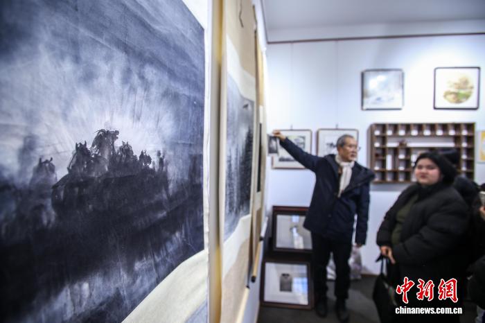 天津:五代画马人笔墨传薪迎马年 12月29日,宫春虎水墨画马艺术中心“喜迎马年,五代画马人马画艺术展”在天津古文化街海雅茶园启幕。展览展示了中国现代水墨画马先驱徐悲鸿先生及其弟子韦江凡、再传弟子宫春虎以及两代学生的马画作品。图为在津外籍 12-29