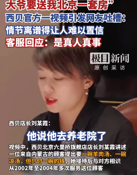 西贝的推文是真是假需要权威调查 西贝自说自话的脱口秀该消停了 9月27日,“西贝回应一碗汤换顾客北京一套房”冲上热搜。据报道,有网友扒出一则西贝官方发布的视频《我给大爷一碗汤,大爷要送我北京一套房》,引发许多人吐槽。这则视频是网友“考古”挖出来的,事件已经过去20多年了。视频中,西贝北京六里桥旗舰店店... 09-28