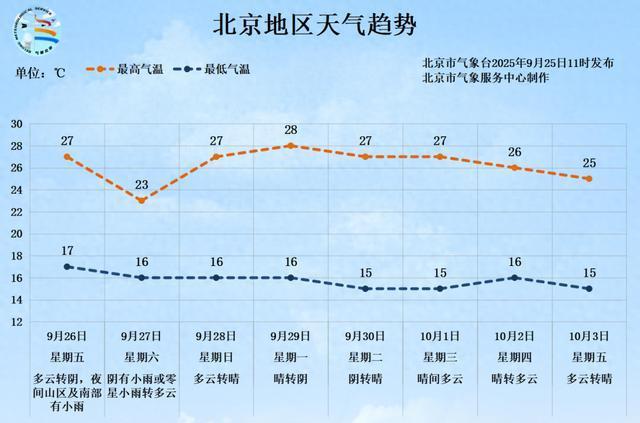 北京双节假期最新天气预报!大部晴到多云,总体适宜出行 昼夜温差大注意添衣 今天北京天气以晴到多云为主,气温回升,预计最高气温在28℃左右,体感舒适,适合开窗通风和户外活动。紫外线较强,外出时应做好遮阳防晒措施;空气干燥,记得及时补充水分 09-28