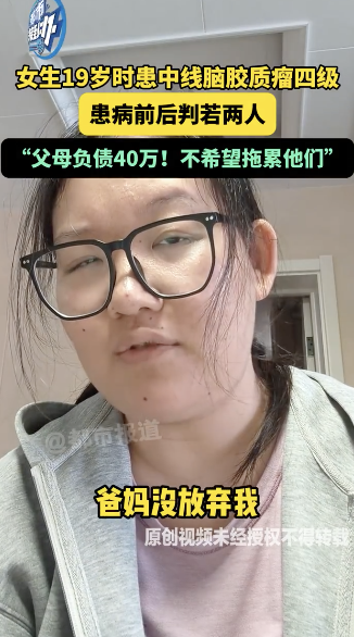 女生19岁时患中线脑胶质瘤四级:爸妈都没有放弃我,我就更要撑下去 女生19岁时患中线脑胶质瘤四级。10月13日(发布)河南。周女士19岁时刚上大一,读的是护理专业,人生却因一场疾病彻底改变——她被确诊患上弥漫性中线脑胶质瘤(四级)。2021年8月,她开始持续咳嗽、头痛,检查后得知脑中有肿瘤,但当时医生说“... 10-14