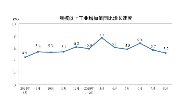 国家统计局:8月份规模以上工业增加值增长5.2% 中新网9月15日电 据国家统计局网站消息,8月份,规模以上工业增加值同比实际增长5.2%(增加值增速均为扣除价格因素的实际增长率)。从环比看,8月份,规模以上工业增加值比上月增长0.37%。1—8月份,规模以上工业增加值 09-15